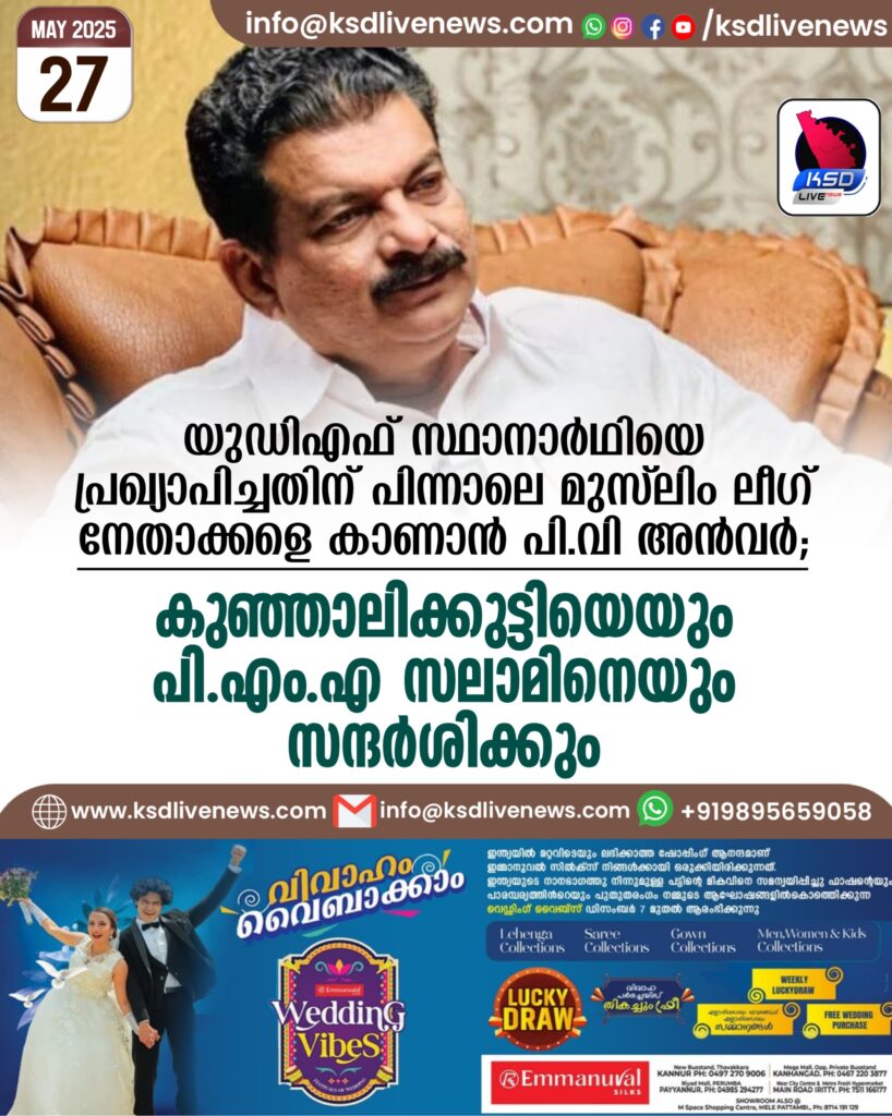 യുഡിഎഫ് സ്ഥാനാര്ഥിയെ പ്രഖ്യാപിച്ചതിന് പിന്നാലെ മുസ്ലിം ലീഗ് നേതാക്കളെ കാണാന് പി വി അന്വര്; കുഞ്ഞാലിക്കുട്ടിയെയും പിഎംഎ സലാമിനെയും സന്ദര്ശിക്കും