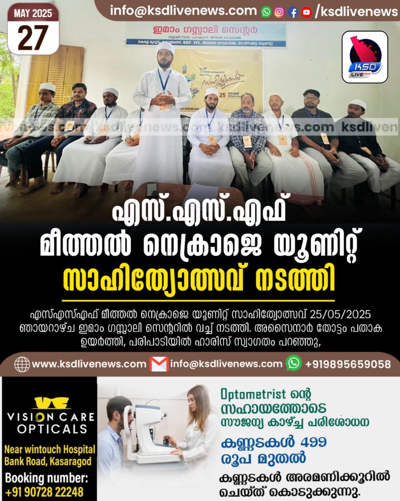 എസ്എസ്എഫ് മീത്തൽ നെക്രാജെ യൂണിറ്റ് സാഹിത്യോത്സവ് 25/05/2025 ഞായറാഴ്ച ഇമാം ഗസ്സാലി സെന്ററിൽ വച്ച് നടത്തി. അസൈനാർ തോട്ടം പതാക ഉയർത്തി, പരിപാടിയിൽ ഹാരിസ് സ്വാഗതം പറഞ്ഞു, റസീൻ അധ്യക്ഷത വഹിച്ചു, ഷംഷാദ് ഹിമമി  ഉദ്ഘാടനം ചെയ്തു, അക്ബർ അലി സഅദി അബൂബക്കർ ഹിമാമി എന്നിവർ ഉൽബോധന പ്രസംഗം നടത്തി, ഹനീഫ് മുംബൈ, ഇബ്രാഹിം എൻ പി  ആശംസ പ്രസഗം നടത്തി, ആദിയിൽ നന്ദി അറിയിച്ചു. യൂണിറ്റിൽ നിന്ന് 50 ഓളം കുട്ടികൾ പങ്കെടുത്തു.