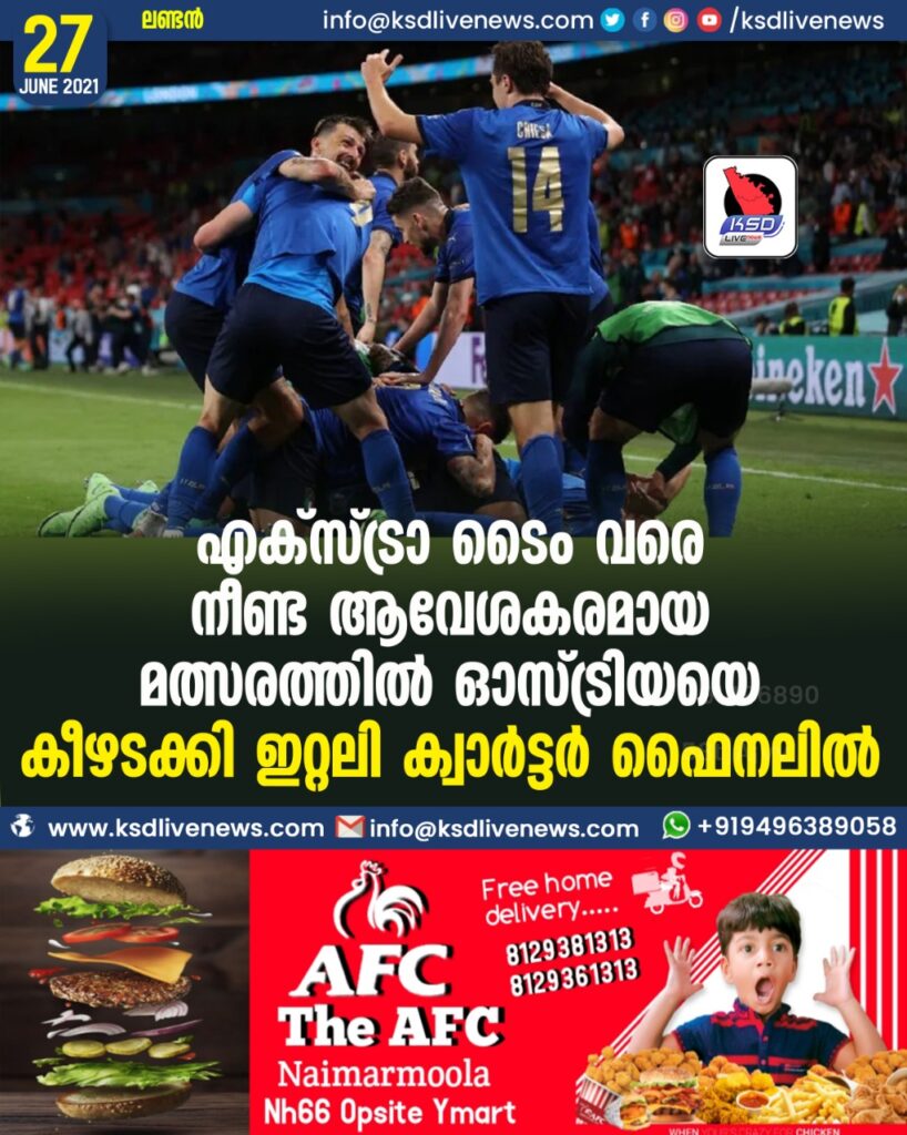 എക്സ്ട്രാ ടൈം വരെ നീണ്ട ആവേശകരമായ മത്സരത്തില് ഓസ്ട്രിയയെ കീഴടക്കി ഇറ്റലി ക്വാര്ട്ടര് ഫൈനലില്