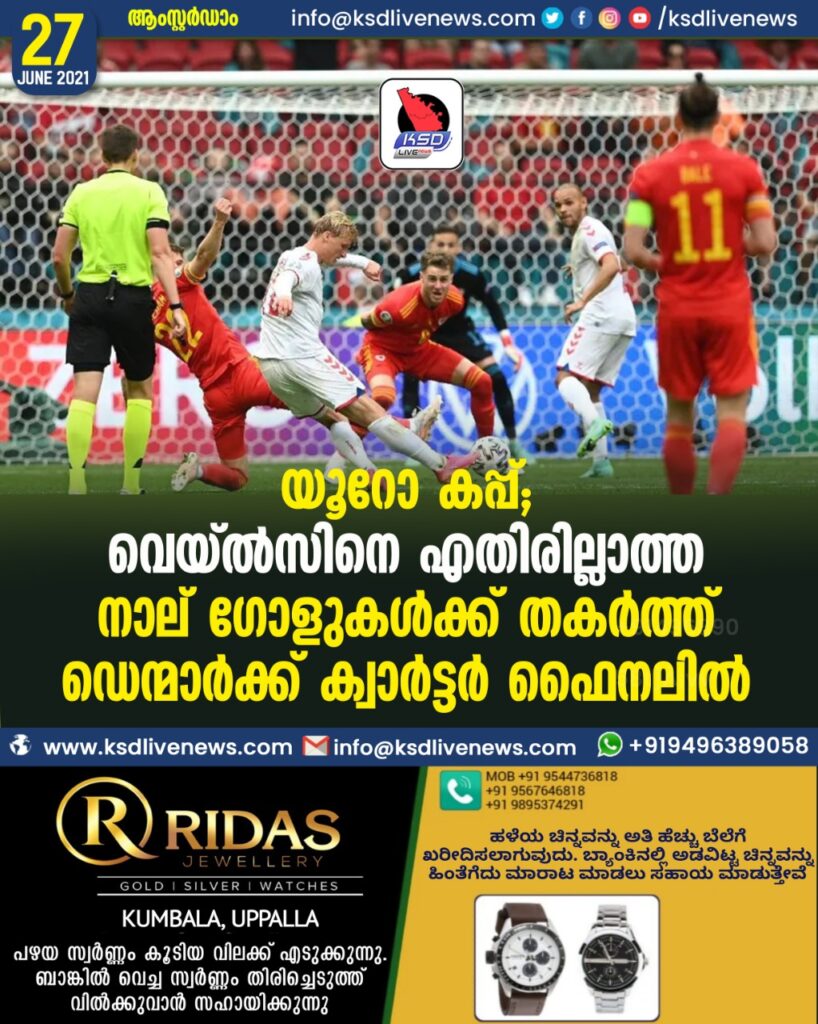 ആംസ്റ്റർഡാം: 2020 യൂറോകപ്പിന്റെ ക്വാർട്ടർ ഫൈനലിലെത്തുന്ന ആദ്യ ടീം എന്ന നേട്ടം സ്വന്തമാക്കി ഡെന്മാർക്ക്. പ്രീ ക്വാർട്ടറിൽ കരുത്തരായ വെയ്ൽസിനെ എതിരില്ലാത്ത നാല് ഗോളുകൾക്ക് തകർത്താണ് ഡെന്മാർക്ക് അവസാന എട്ടിൽ എത്തിയത്. മത്സരത്തിലുടനീളം ആധിപത്യം പുലർത്തിയാണ് ഡെന്മാർക്ക് കഴിഞ്ഞ യൂറോകപ്പിലെ സെമി ഫൈനലിസ്റ്റുകളായ വെയ്ൽസിനെ മടക്കിയയച്ചത്. ഡെന്മാർക്കിനായി യുവതാരം കാസ്പെർ ഡോൾബെർഗ് ഇരട്ട ഗോളുകൾ നേടിയപ്പോൾ യോക്കിം മേൽ, മാർട്ടിൻ ബ്രാത്ത്വെയ്റ്റ് എന്നിവരും സ്കോർ ചെയ്തു. മത്സരത്തിൽ മികച്ച ഒരു ഗോളവസരം പോലും സൃഷ്ടിക്കാതെയാണ് ഗരെത് ബെയ്ലും സംഘവും മടങ്ങുന്നത്. ആദ്യ രണ്ട് മത്സരങ്ങളിലും തോറ്റുതുടങ്ങിയ ഡെന്മാർക്ക് അത്ഭുതകരമായ പ്രകടനമാണ് പ്രീക്വാർട്ടറിൽ കാഴ്ചവെച്ചത്. ഡെന്മാർക്ക് രണ്ടും വെയ്ൽസ് മൂന്നും മാറ്റങ്ങളുമായാണ് ഇന്ന് കളിക്കാനിറങ്ങിയത്.തുല്യശക്തികളുടെ പോരാട്ടമായതിനാൽ ഇരുടീമുകളും ഒപ്പത്തിനൊപ്പം നിൽക്കുന്ന പ്രകടനമാണ് പുറത്തെടുത്തത്. 12-ാം മിനിട്ടിൽ വെയ്ൽസ് നായകൻ ഗരെത് ബെയ്ലിന്റെ മികച്ച ഒരു ലോങ്റേഞ്ചർ ഡെന്മാർക്ക് പോസ്റ്റിനെ തൊട്ടുരുമ്മിക്കൊണ്ട് കടന്നുപോയി. 17-ാം മിനിട്ടിൽ വെയ്ൽസിന്റെ ഡാനിയൽ ജെയിംസിന്റെ ലോങ്റേഞ്ചർ ഡെന്മാർക്ക് ഗോൾകീപ്പർ ഷ്മൈക്കേൽ കൈയ്യിലൊതുക്കി. ആക്രമണങ്ങൾക്ക് വെയ്ൽസാണ് മുന്നിട്ടുനിന്നതെങ്കിലും ബെയ്ലിനെയും സംഘത്തെയും ഞെട്ടിച്ചുകൊണ്ട് ഡെന്മാർക്ക് മത്സരത്തിൽ ലീഡെടുത്തു. 27-ാം മിനിട്ടിൽ യുവതാരം കാസ്പെർ ഡോൾബെർഗാണ് ടീമിനായി ഗോൾ നേടിയത്. ഡാംസ്ഗാർഡിൽ നിന്നും പന്ത് സ്വീകരിച്ച ഡോൾബെർഗ് അതിമനോഹരമായി പന്ത് വലയിലെത്തിച്ചു. ബോക്സിന് പുറത്തുനിന്നും താരമെടുത്ത കിക്ക് മഴവില്ലുപോലെ വളഞ്ഞ് ഗോൾകീപ്പർ വാർഡിനെ മറികടന്ന് വലയിലെത്തി. 1992 ന് ശേഷം യൂറോ കപ്പ് നോക്കൗട്ട് റൗണ്ടിൽ ഡെന്മാർക്ക് നേടുന്ന ആദ്യ ഗോളാണിത്. ഗോൾ നേടിയതോടെ ഡെന്മാർക്ക് ആക്രമണത്തിന് ശക്തി കൂട്ടി. 32-ാം മിനിട്ടിൽ ഡോൾബെർഗിന് വെൽസ് ബോക്സിനകത്തുവെച്ച് സുവർണാവസരം ലഭിച്ചെങ്കിലും ഇത്തവണ താരത്തിന് ലക്ഷ്യം കാണാൻ സാധിച്ചില്ല. തൊട്ടുപിന്നാലെ ഗോളെന്നുറച്ച ഒരു ഷോട്ട് രക്ഷപ്പെടുത്തി വാർഡ് വെയ്ൽസിന്റെ രക്ഷകനായി. 40-ാം മിനിട്ടിൽ വെയ്ൽസിന്റെ വിശ്വസ്തനായ പ്രതിരോധതാരം കോണർ റോബർട്സ് പരിക്കേറ്റ് പുറത്തായത് ടീമിന് തിരിച്ചടിയായി. ആദ്യ മിനിട്ടുകളിൽ മികച്ച പ്രകടനം പുറത്തെടുത്ത വെയ്ൽസ് ഗോൾ വഴങ്ങിയതോടെ പ്രതിരോധത്തിലായി. 45-ാം മിനിട്ടിൽ ഡെന്മാർക്കിന്റെ മേലിന് മികച്ച അവസരം ലഭിച്ചെങ്കിലും താരത്തിന്റെ കിക്ക് പോസ്റ്റിന് വെളിയിലേക്ക് പോയി. രണ്ടാം പകുതിയുടെ തുടക്കത്തിൽ തന്നെ വെയ്ൽസിന്റെ നെഞ്ചിൽ തീകോരിയിട്ട് കാസ്പെർ ഡോൾബെർഗ് വീണ്ടും ഗോൾ 
