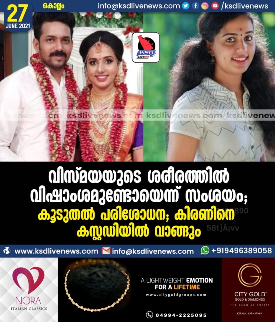 വിസ്മയയുടെ ശരീരത്തില്‍ വിഷാംശമുണ്ടോയെന്ന് സംശയം, കൂടുതല്‍ പരിശോധന; കിരണിനെ കസ്റ്റഡിയില്‍ വാങ്ങും