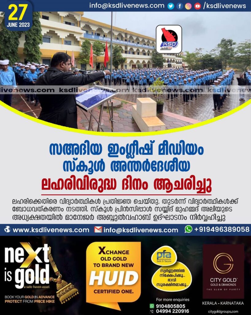ദേളി: സഅദിയ ഇംഗ്ലീഷ് മീഡിയം സ്കൂളിൽ ലഹരിവിരുദ്ധ ദിനം ആചരിച്ചു. ലഹരിക്കെതിരെ വിദ്യാർത്ഥികൾ പ്രതിജ്ഞ ചെയ്തു. തുടർന്ന് വിദ്യാർത്ഥികൾക്ക് ബോധവത്കരണം നടത്തി.