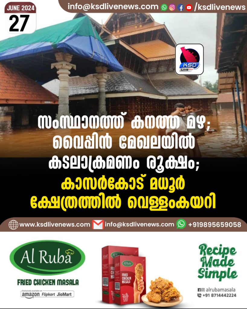 സംസ്ഥാനത്ത് കനത്ത മഴ: വൈപ്പിന്‍ മേഖലയില്‍ കടലാക്രമണം രൂക്ഷം; കാസർകോട് മധൂർ ക്ഷേത്രത്തിൽ വെള്ളംകയറി