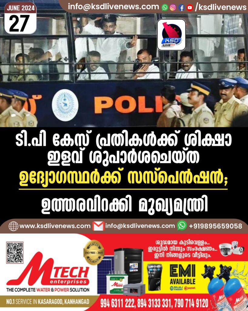 ടി.പി കേസ് പ്രതികൾക്ക് ശിക്ഷാ ഇളവ് ശുപാർശചെയ്ത ഉദ്യോഗസ്ഥർക്ക് സസ്പെൻഷൻ; ഉത്തരവിറക്കി മുഖ്യമന്ത്രി