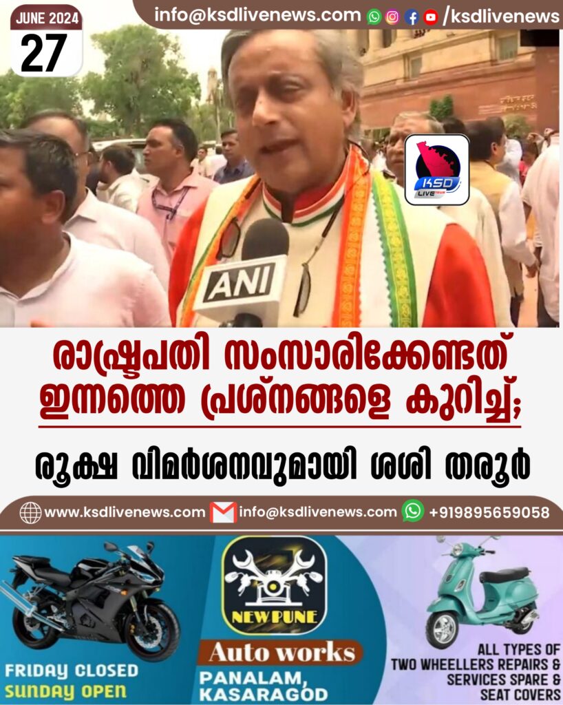 ന്യൂഡൽഹി: പാർലമെന്റ് സംയുക്ത സമ്മേളനത്തെ അഭിസംബോധന ചെയ്ത് രാഷ്ട്രപതി ദ്രൗപതി മുർമു നടത്തിയ പ്രസംഗത്തെ രൂക്ഷമായി വിമർശിച്ച് കോൺഗ്രസ് എം.പി. ശശി തരൂർ. ഇന്നത്തെ പ്രശ്നങ്ങളെ കുറിച്ചാണ് രാഷ്ട്രപതി സംസാരിക്കേണ്ടിയിരുന്നതെന്ന് ശശി തരൂർ പറഞ്ഞു.