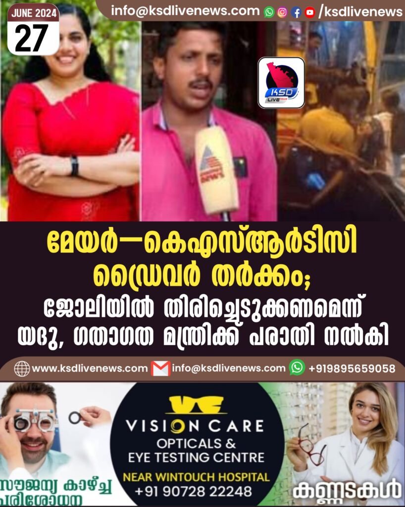 മേയർ–കെഎസ്ആർടിസി ഡ്രൈവർ തർക്കം: ജോലിയില്‍ തിരിച്ചെടുക്കണമെന്ന് യദു, ഗതാഗത മന്ത്രിക്ക് പരാതി നൽകി
