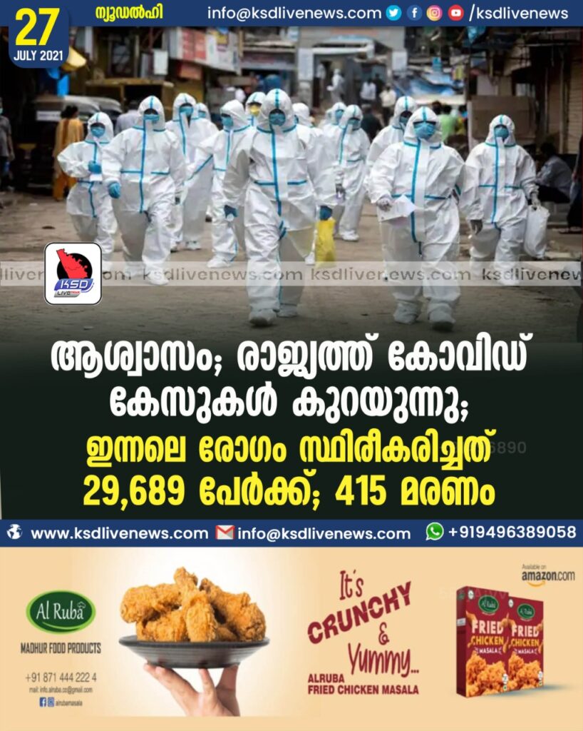 ആശ്വാസം ; രാജ്യത്ത് കോവിഡ് കേസുകൾ കുറയുന്നു; ഇന്നലെ രോഗം സ്ഥിരീകരിച്ചത് 29,689 പേര്ക്ക്; 415 മരണം