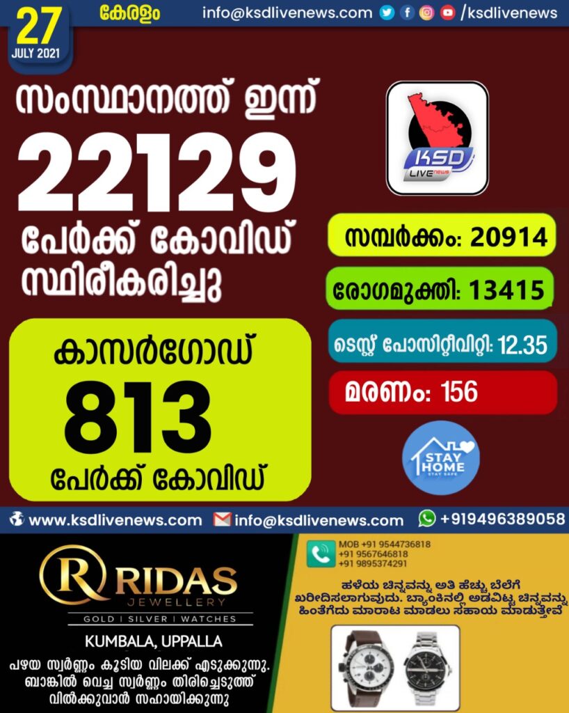 കോവിഡിൽ വിറച്ച് കേരളം; സംസ്ഥാനത്ത് ഇന്ന് 22129 പേർക്ക് കോവിഡ് സ്ഥിരീകരിച്ചു. സമ്പർക്കം വഴി 20914 പേർക്കും ; ആശ്വാസമായി 13415 പേർക്ക് രോഗ മുക്തിയും ; കാസർഗോഡ് ജില്ലയിൽ 813 പേർക്ക് പുതിയ കോവിഡ് കേസുകൾ ; മരണം 156