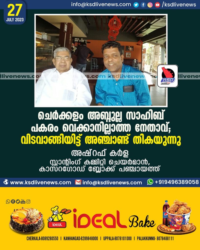 ഉത്തര മലബാറിലെ സാമൂഹിക, രാഷ്ട്രീയ, സാംസ്കാരിക, സാമുദായിക മേഖലകളിൽ ചെർക്കളം അബ്ദുള്ള സാഹിബ് ചെലുത്തിയ സ്വാധീനം സുവർണ ലിപികളാൽ എഴുതപ്പെടേണ്ട കാലഘട്ടമാണ്. ‘ചെർക്കളം കാലഘട്ടം’ എന്ന് തന്നെ ആ കാലഘട്ടത്തെ നമുക്ക് വിശേഷിപ്പിക്കാം. പകരം വെക്കാനില്ലാത്ത സാമൂഹിക പരിഷ്‌കർത്താവ്. വേർപാടിൻറെ രണ്ടാണ്ട് തികയുന്ന ഈ വേളയിൽ നമുക്ക് മനസിലാക്കുവാൻ സാധിക്കുന്നത് രാഷ്ട്രീയ, സാമൂഹിക രംഗത്ത് കാസറഗോഡിന് ചെർക്കളത്തിന്റെ വിടവ് നികത്താനാവാത്ത ഒരു ശൂന്യതയായി ഇന്നും അവശേഷിക്കുന്നു എന്ന് തന്നെയാണ്. അദ്ദേത്തിൻറെ മഗ്‌ഫിറത്തിന് വേണ്ടി പ്രാർത്ഥിക്കുന്നു.