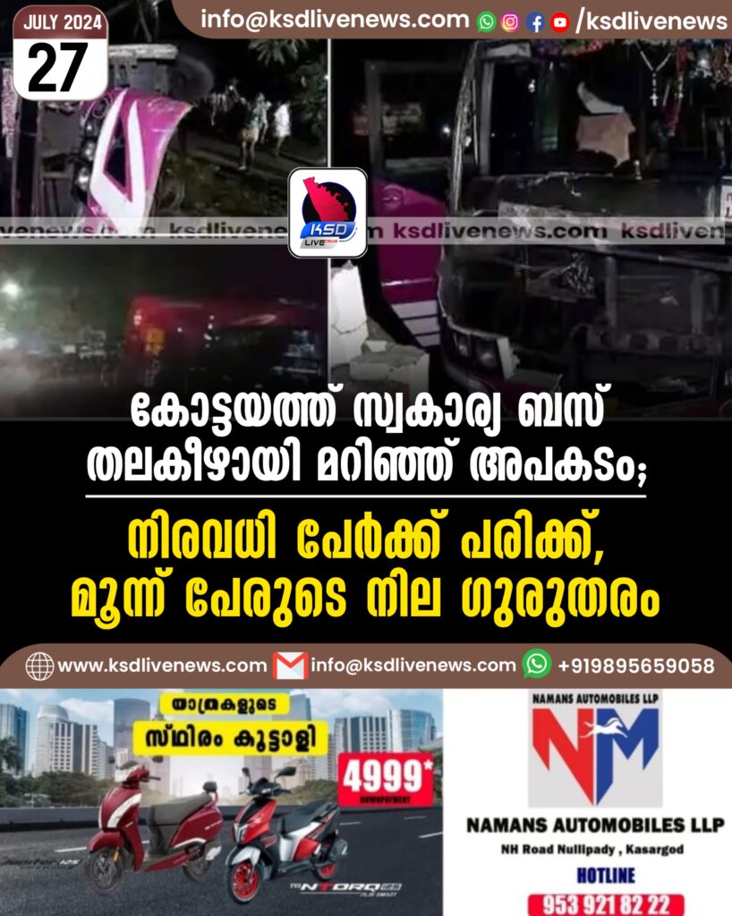 കോട്ടയത്ത് സ്വകാര്യ ബസ് തലകീഴായി മറിഞ്ഞ് അപകടം; നിരവധി പേര്‍ക്ക് പരിക്ക്, മൂന്ന് പേരുടെ നില ഗുരുതരം