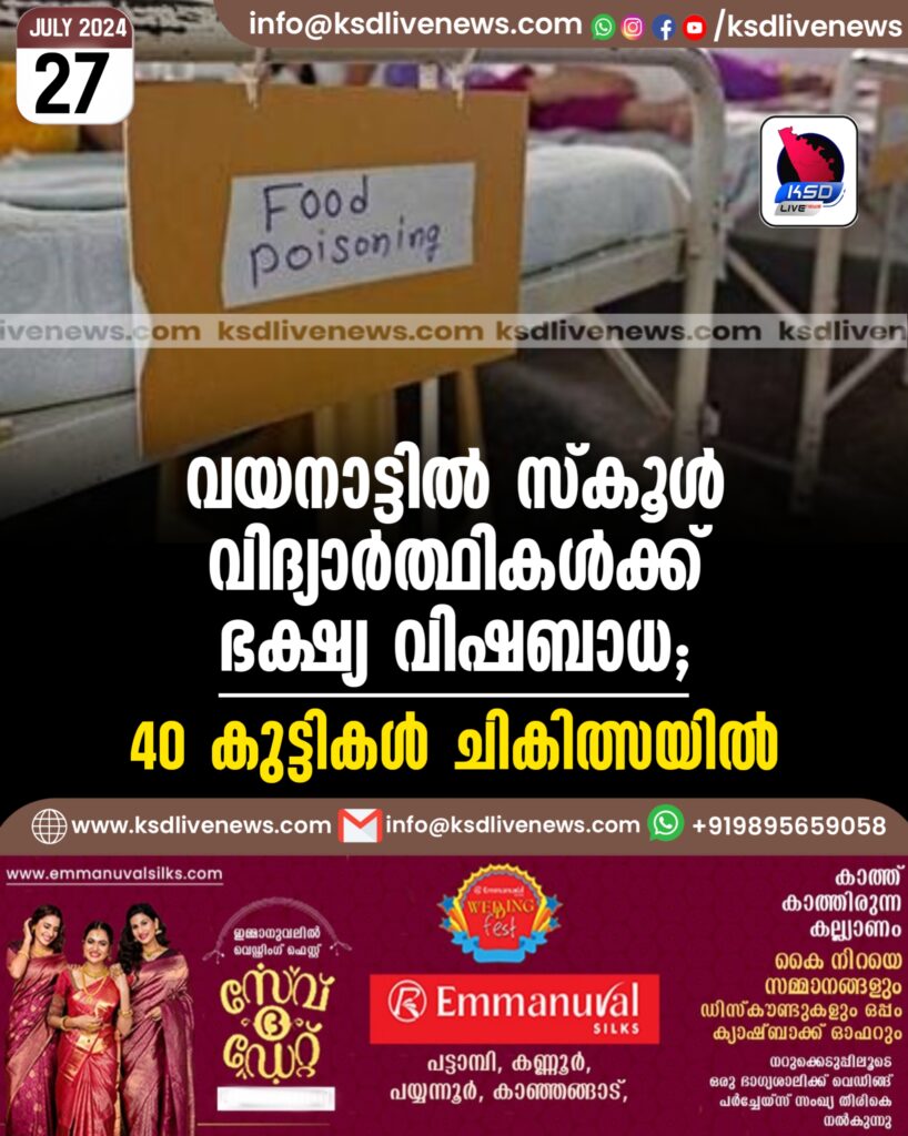 വയനാട്ടില് സ്കൂള് വിദ്യാര്ത്ഥികള്ക്ക് ഭക്ഷ്യ വിഷബാധ; 40 കുട്ടികൾ ചികിത്സയില്