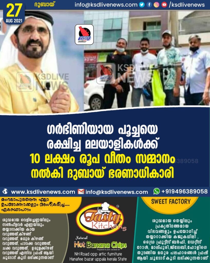 ഗര്ഭിണിയായ പൂച്ചയെ രക്ഷിച്ച മലയാളികള്ക്ക് 10 ലക്ഷം രൂപ വീതം സമ്മാനം നല്കി ദുബായ് ഭരണാധികാരി