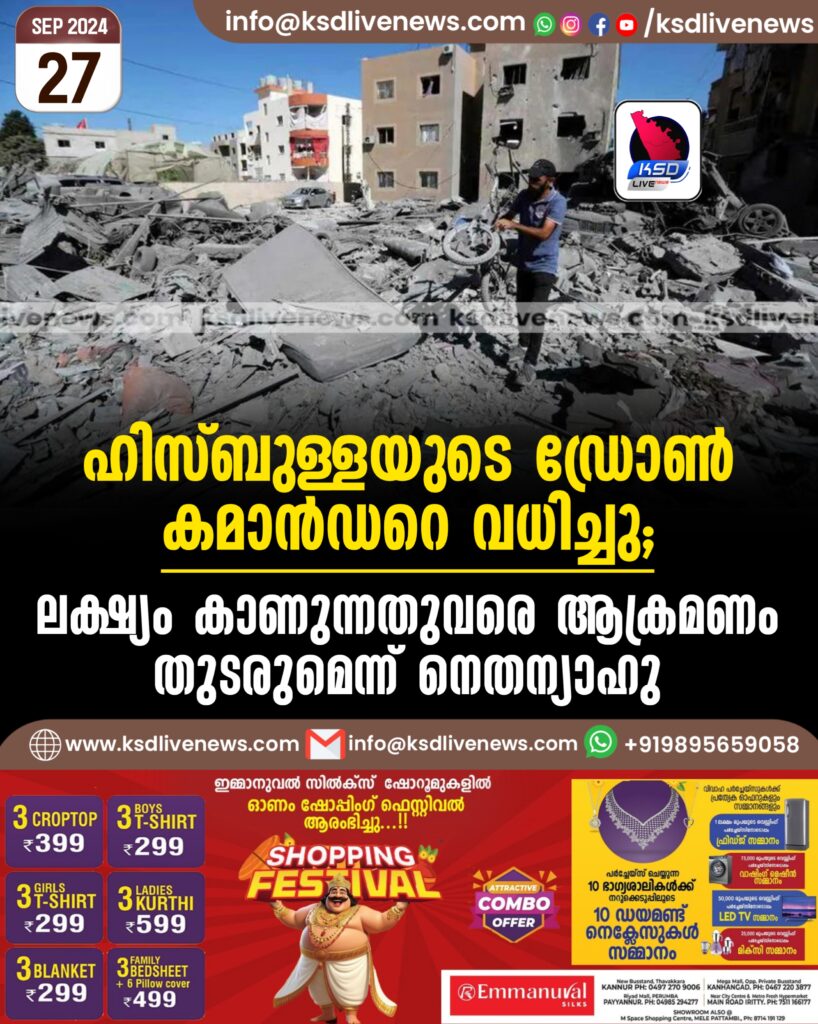 ഹിസ്ബുള്ളയുടെ ഡ്രോണ്‍ കമാന്‍ഡറെ വധിച്ചു; ലക്ഷ്യം കാണുന്നതുവരെ ആക്രമണം തുടരുമെന്ന് നെതന്യാഹു