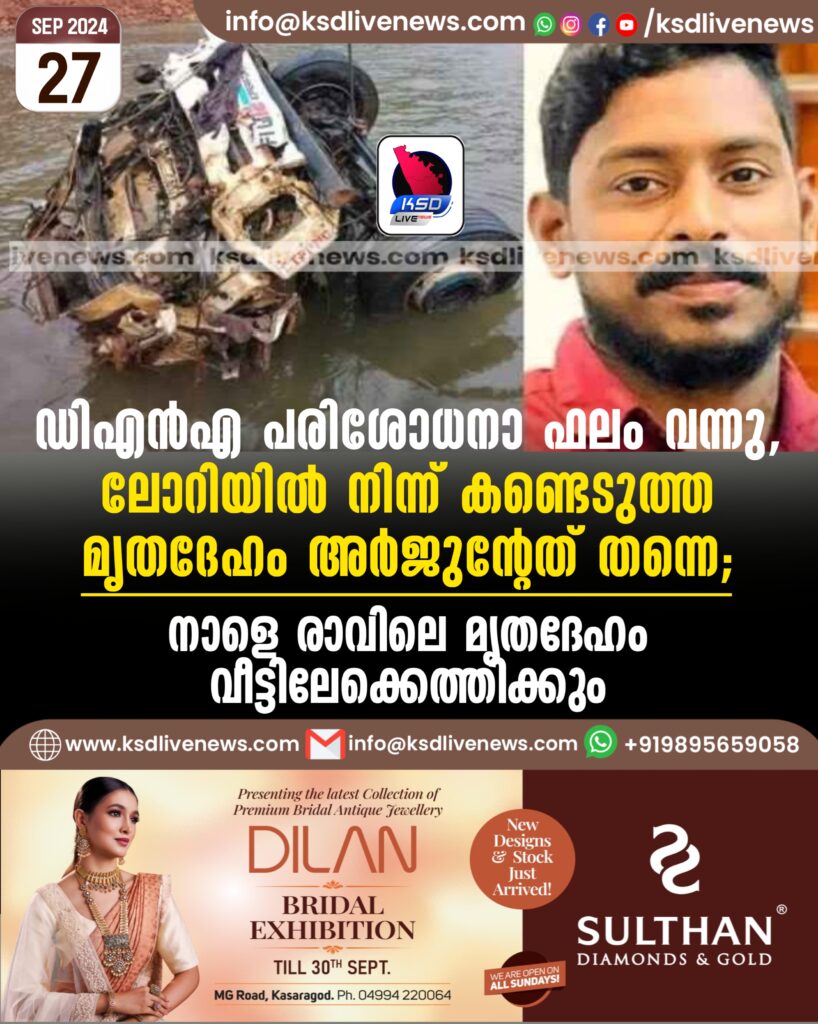 ഡിഎൻഎ പരിശോധനാ ഫലം വന്നു, ലോറിയിൽ നിന്ന് കണ്ടെടുത്ത മൃതദേഹം അര്ജുന്റേത് തന്നെ; നാളെ രാവിലെ മൃതദേഹം വീട്ടിലേക്കെത്തിക്കും