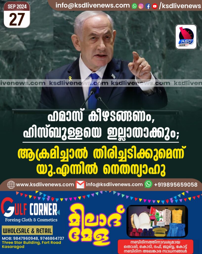 ഹമാസ് കീഴടങ്ങണം, ഹിസ്ബുള്ളയെ ഇല്ലാതാക്കും; ആക്രമിച്ചാൽ തിരിച്ചടിക്കുമെന്ന് യു.എന്നിൽ നെതന്യാഹു