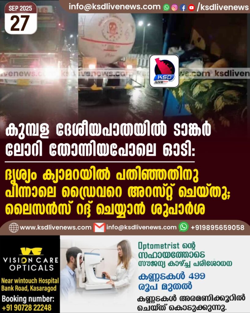 കുമ്പള ദേശീയപാതയിൽ ടാങ്കർ ലോറി തോന്നിയപോലെ ഓടി: ദൃശ്യം ക്യാമറയിൽ പതിഞ്ഞതിനു പിന്നാലെ ഡ്രൈവറെ അറസ്റ്റ് ചെയ്തു; ലൈസൻസ് റദ്ദ് ചെയ്യാൻ ശുപാർശ
