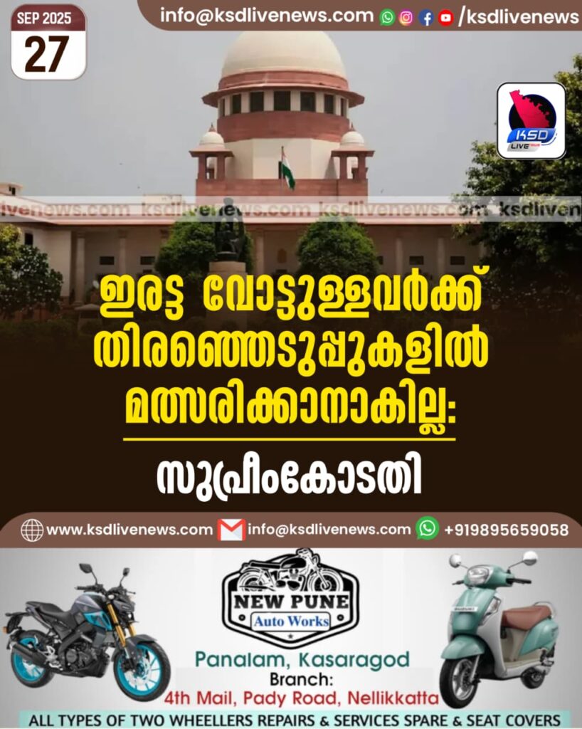 ഇരട്ട വോട്ടുള്ളവര്‍ക്ക് തിരഞ്ഞെടുപ്പുകളില്‍ മത്സരിക്കാനാകില്ല -സുപ്രീം കോടതി