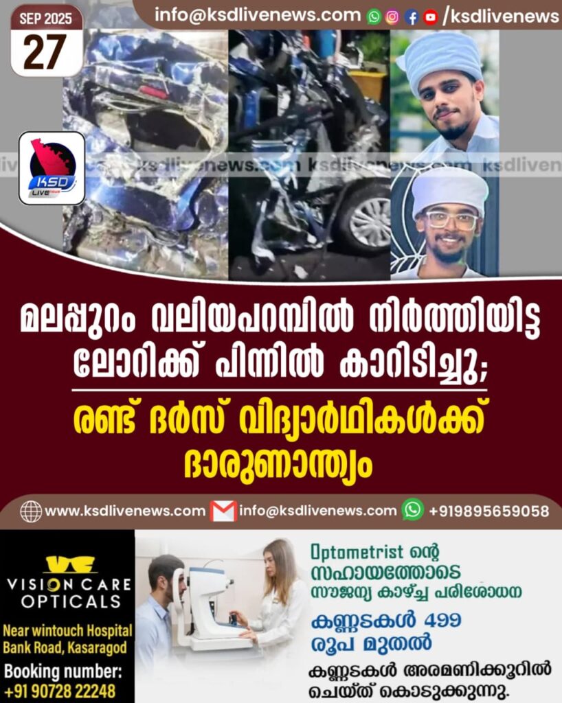 മലപ്പുറം വലിയപറമ്പിൽ നിർത്തിയിട്ട ലോറിക്ക് പിന്നിൽ കാറിടിച്ചു; രണ്ട് ദർസ് വിദ്യാർഥികൾക്ക് ദാരുണാന്ത്യം