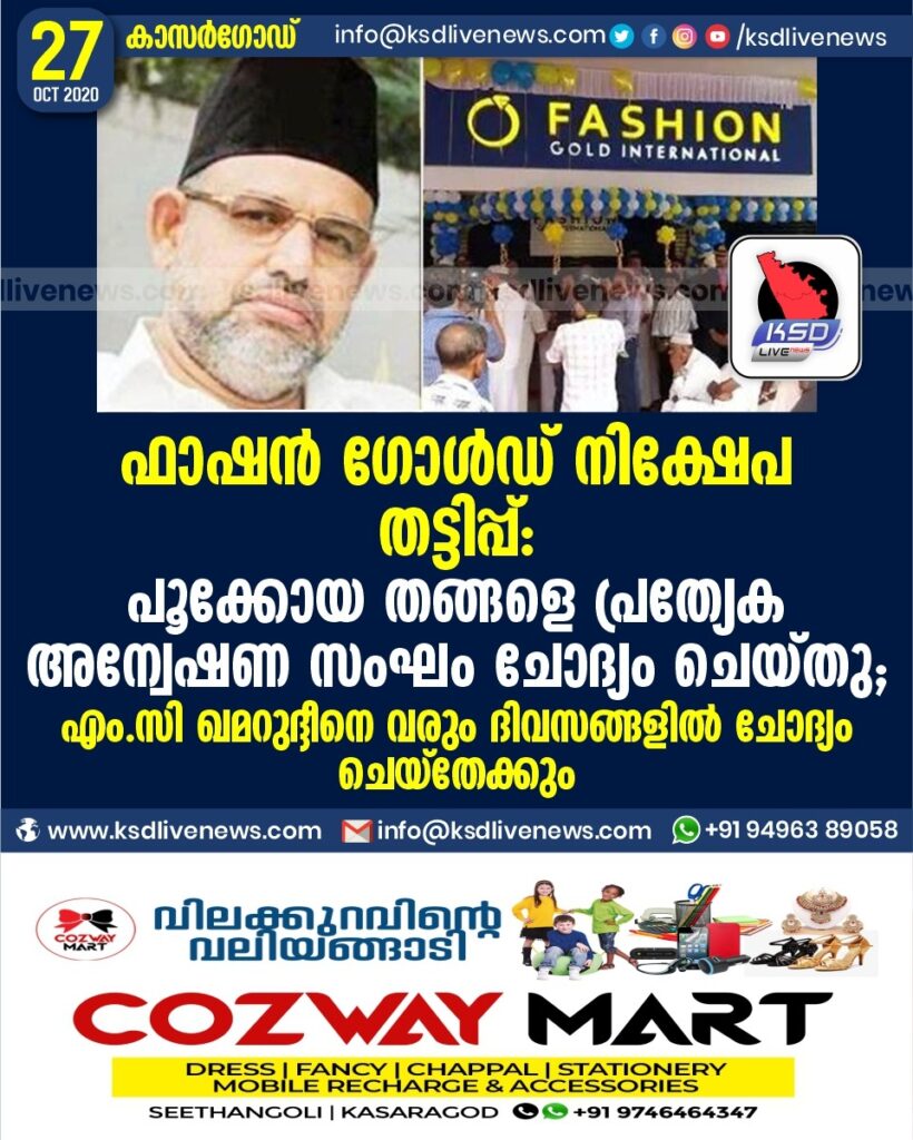 ഫാഷൻ ഗോൾഡ് നിക്ഷേപ തട്ടിപ്പ്: പൂക്കോയ തങ്ങളെ പ്രത്യേക അന്വേഷണ സംഘം ചോദ്യം ചെയ്തു ; എം.സി ഖമറുദ്ദീനെ വരും ദിവസങ്ങളിൽ ചോദ്യം ചെയ്തേക്കും