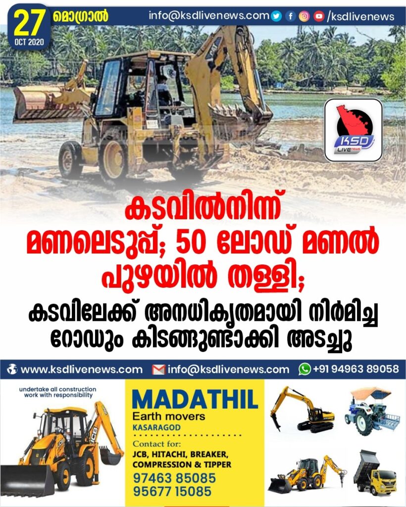 കുമ്പള: മൊഗ്രാൽ അനധികൃത കടവിൽ കൂട്ടിയിട്ട 50 ലോഡ് മണൽ പുഴയിലേക്ക് തള്ളി. തിങ്കളാഴ്ച രാവിലെ 11 മണിയോടെയാണ് കുമ്പള ഇൻസ്പെക്ടർ പി. പ്രമോദിന്റെ നേതൃത്വത്തിലുള്ള സംഘം അനധികൃത കടവിൽ കൂട്ടിയിട്ട മണൽ കണ്ടെത്തിയത്.ഉടൻ മണ്ണുമാന്തിയന്ത്രം എത്തിച്ച് പുഴയിലേക്ക് തള്ളിയിടുകയായിരുന്നു. കടവിലേക്ക് അനധികൃതമായി നിർമിച്ച റോഡ് കിടങ്ങുണ്ടാക്കി അടച്ചു.