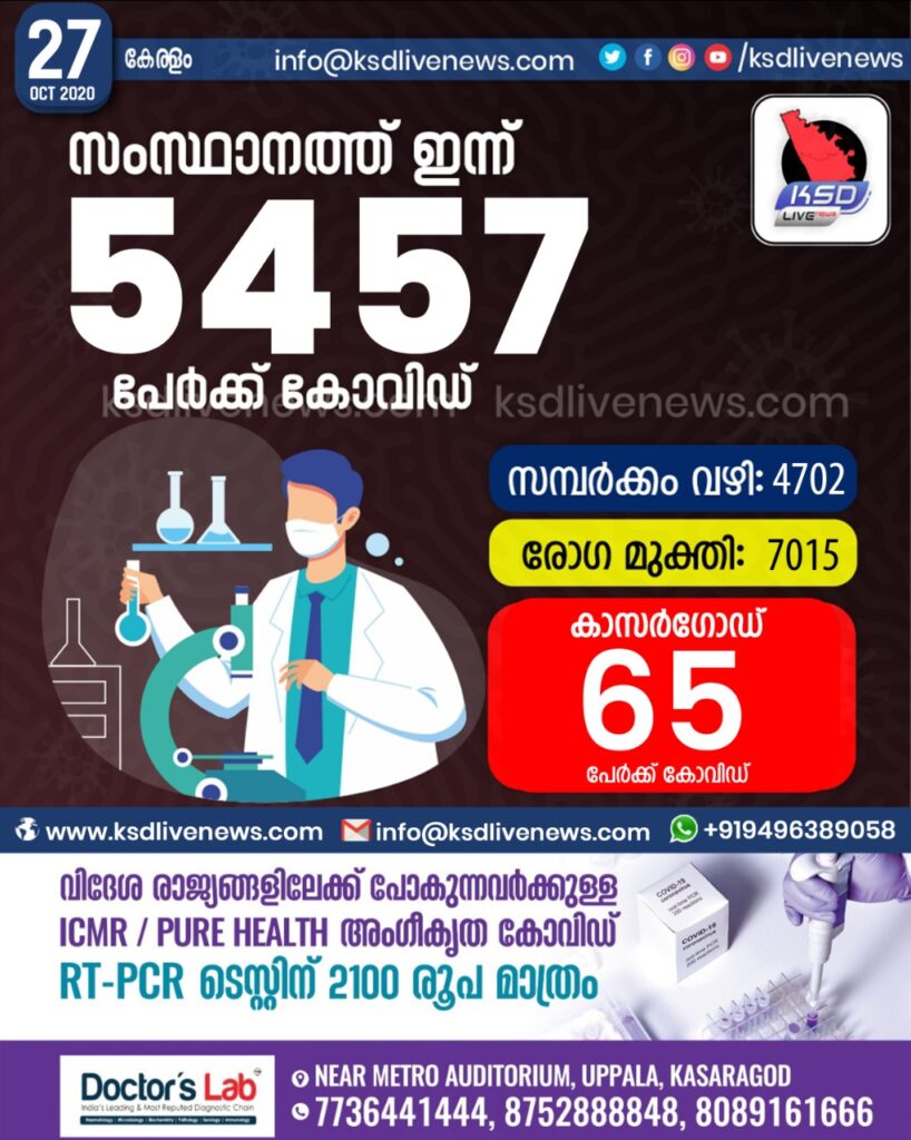 സംസ്ഥാനത്ത് ഇന്ന് 5457 പേർക്ക് കോവിഡ് സ്ഥിരീകരിച്ചു. സമ്പർക്കം വഴി 4702 പേർക്കും.രോഗ മുക്തി 7015 പേർക്കും. കാസർഗോഡ് ജില്ലയിൽ ഇന്ന് 65 പേർക്ക് കോവിഡ് സ്ഥിരീകരിച്ചു. മരണം 24