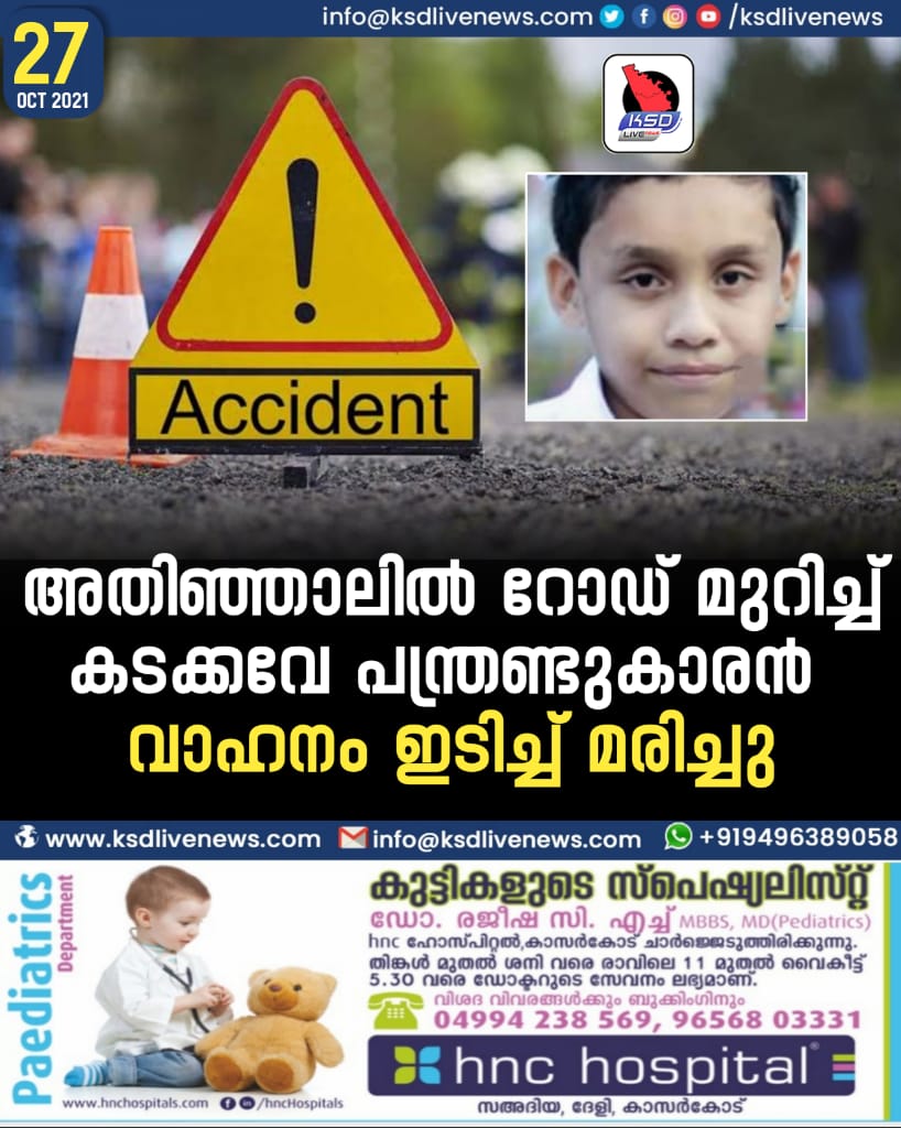 അതിഞ്ഞാലിൽ റോഡ് മുറിച്ച് കടക്കവേ പന്ത്രണ്ടുകാരൻ  വാഹനം ഇടിച്ച് മരിച്ചു