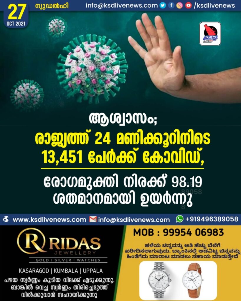 ആശ്വാസം; രാജ്യത്ത് 24 മണിക്കൂറിനിടെ 13,451 പേർക്ക് കോവിഡ്, രോഗ മുക്തി നിരക്ക് 98.19 ശതമാനമായി ഉയർന്നു