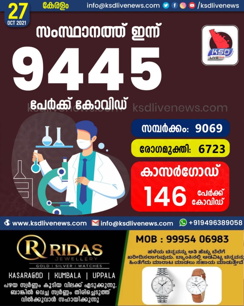 സംസ്ഥാനത്ത് ഇന്ന് 9445 പേർക്ക് കോവിഡ് സ്ഥിരീകരിച്ചു. സമ്പർക്കം വഴി 9069 പേർക്കും ; ആശ്വാസമായി 6723 പേർക്ക് രോഗ മുക്തിയും ; കാസർഗോഡ് ജില്ലയിൽ 146 പേർക്ക് പുതിയ കോവിഡ് കേസുകൾ ; മരണം 93