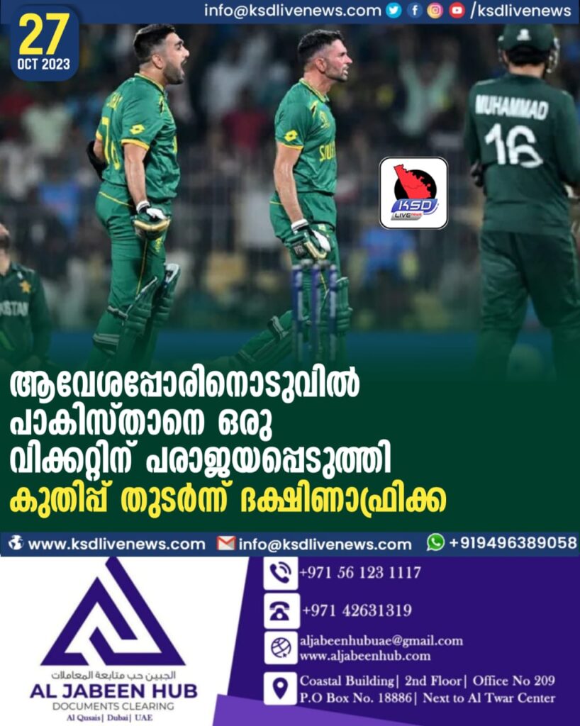 ആവേശപ്പോരിനൊടുവില് പാകിസ്താനെ ഒരു വിക്കറ്റിന് പരാജയപ്പെടുത്തി കുതിപ്പ് തുടര്ന്ന് ദക്ഷിണാഫ്രിക്ക