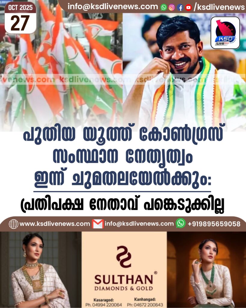 പുതിയ യൂത്ത് കോണ്ഗ്രസ് സംസ്ഥാന നേതൃത്വം ഇന്ന് ചുമതലയേല്ക്കും; പ്രതിപക്ഷ നേതാവ് പങ്കെടുക്കില്ല