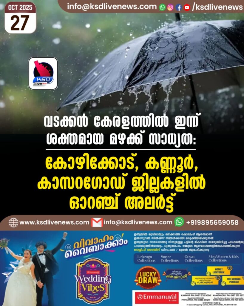 വടക്കൻ കേരളത്തില് ഇന്ന് ശക്തമായ മഴക്ക് സാധ്യത; കോഴിക്കോട്, കണ്ണൂര്, കാസറഗോഡ് ജില്ലകളില് ഓറഞ്ച് അലര്ട്ട്