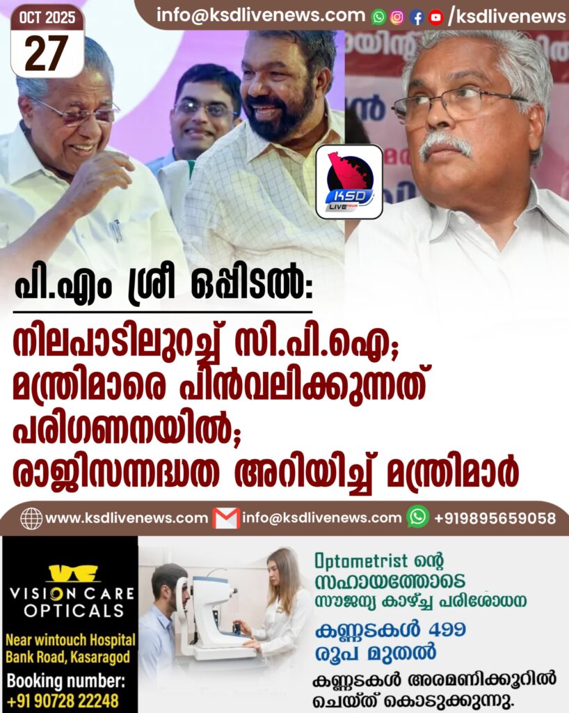പി.എം ശ്രീ ഒപ്പിടല്: നിലപാടിലുറച്ച് സിപിഐ, മന്ത്രിമാരെ പിന്വലിക്കുന്നത് പരിഗണനയില്; രാജിസന്നദ്ധത അറിയിച്ച് മന്ത്രിമാര്
