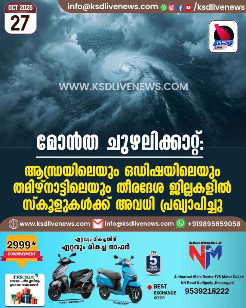 മോന്ത ചുഴലിക്കാറ്റ്: ആന്ധ്രയിലെയും ഒഡിഷയിലെയും തമിഴ്നാട്ടിലെയും തീരദേശ ജില്ലകളില് സ്കൂളുകള്ക്ക് അവധി പ്രഖ്യാപിച്ചു
