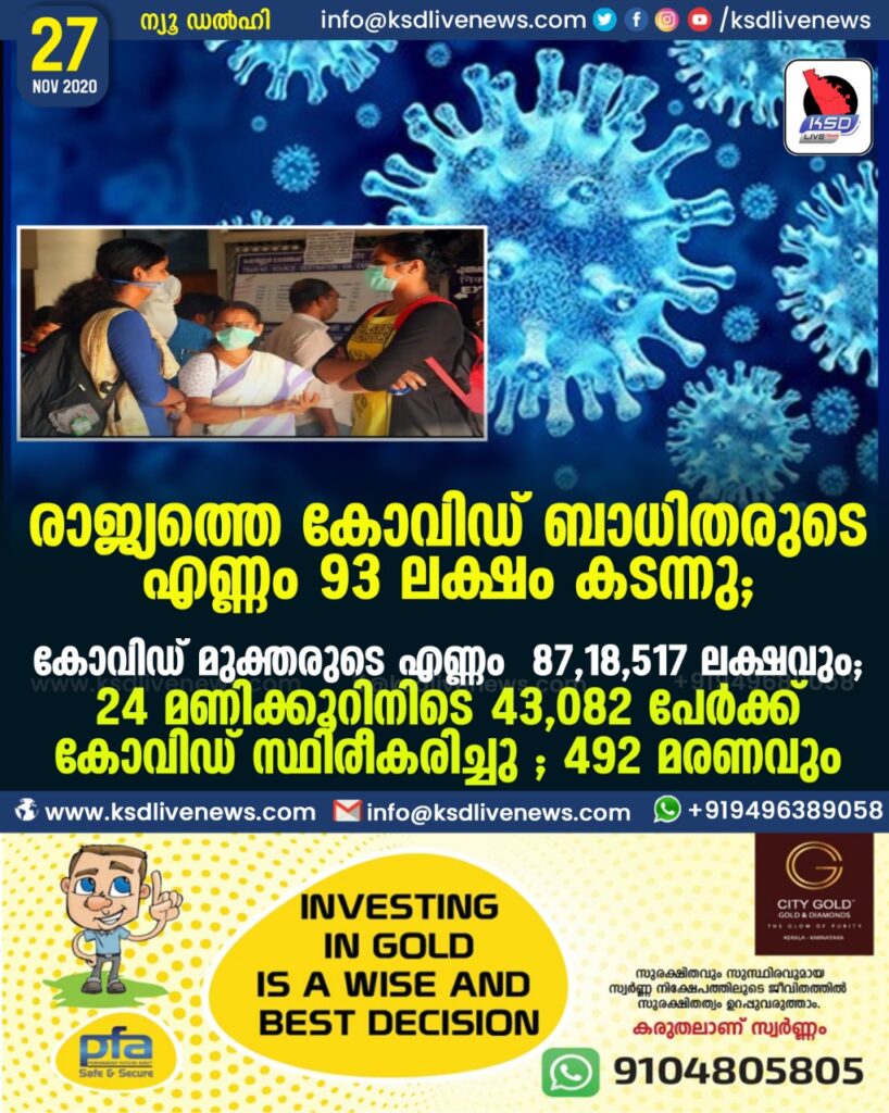 രാജ്യത്തെ കോവിഡ് ബാധിതരുടെ എണ്ണം 93 ലക്ഷം കടന്നു ; കോവിഡ് മുക്തരുടെ എണ്ണം 87,18,517 ലക്ഷവും ;