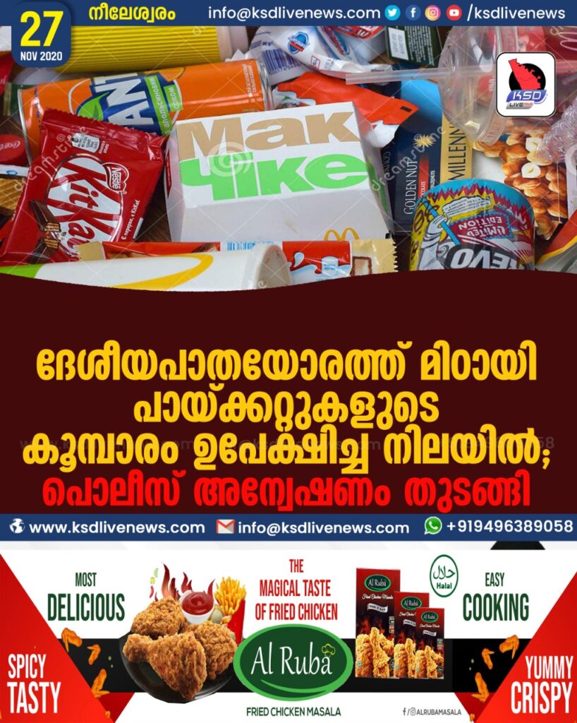 ദേശീയപാതയോരത്ത് മിഠായി പായ്ക്കറ്റുകളുടെ കൂമ്പാരം ഉപേക്ഷിച്ച നിലയില് ; പൊലീസ് അന്വേഷണം തുടങ്ങി