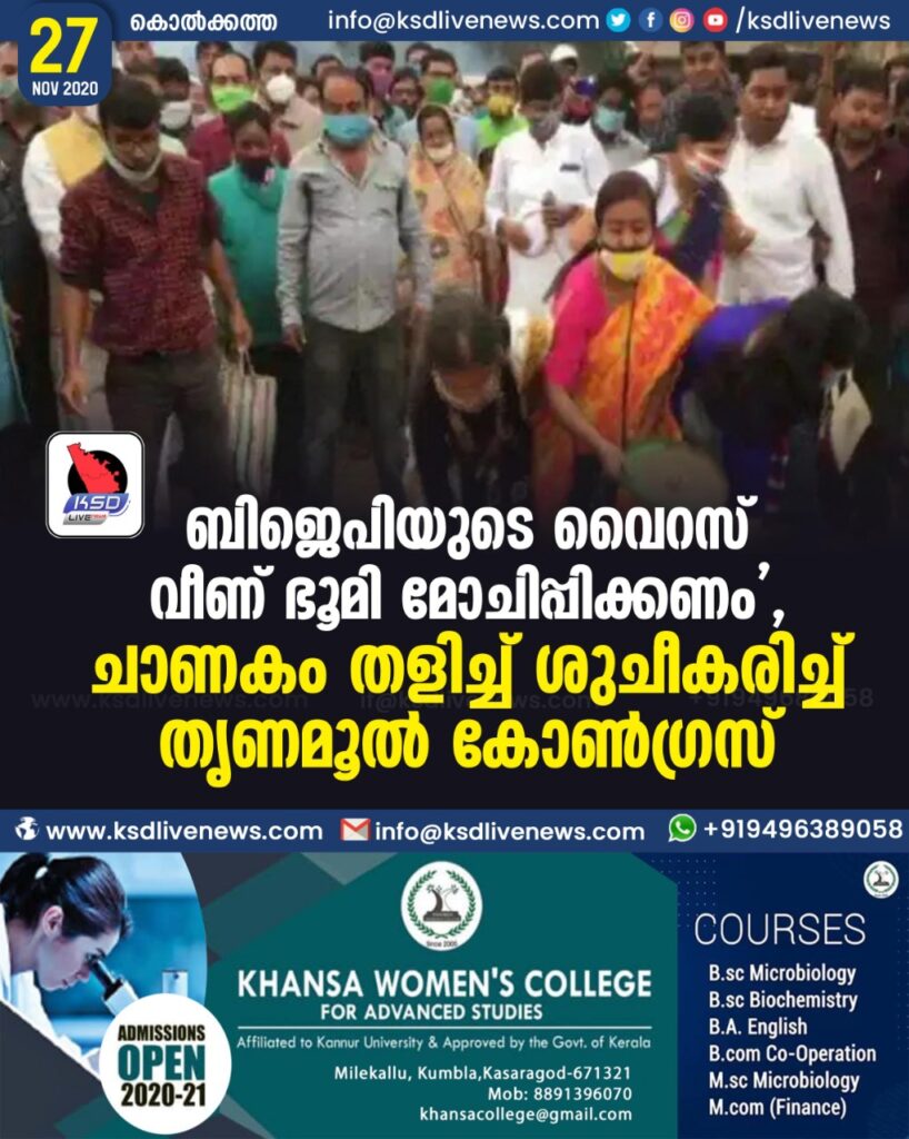 ബിജെപിയുടെ വൈറസ് വീണ് ഭൂമി മോചിപ്പിക്കണം ‘ , ചാണകം തളിച്ച് ശുചീകരിച്ച് തൃണമൂൽ കോൺഗ്രസ്
