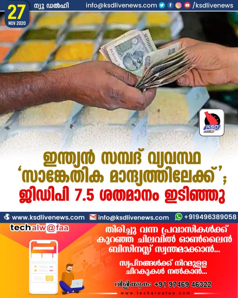 ന്യൂഡല്‍ഹി: നടപ്പു സാമ്ബത്തിക വര്‍ഷത്തിന്റെ രണ്ടാം പാദത്തിലും രാജ്യത്തിന്റെ ജിഡിപിയില്‍ ഇടിവ്. ഇക്കാലയളവില്‍ ജിഡിപിയില്‍ 7.5 ശതമാനത്തിന്റെ ഇടിവാണ് രേഖപ്പെടുത്തിയത്. തൊട്ടുമുന്‍പത്തെ പാദത്തില്‍ ഇത് 23.9 ശതമാനമായിരുന്നു. രണ്ട് പാദങ്ങളില്‍ തുടര്‍ച്ചയായി ഇടിവ് രേഖപ്പെടുത്തിയതോടെ രാജ്യത്തിന്റെ സമ്ബദ് വ്യവസ്ഥ സാങ്കേതിക മാന്ദ്യ അവസ്ഥയിലേക്ക് നീങ്ങിയെന്ന് പറയാമെന്ന് വിദഗ്ധര്‍ മുന്നറിയിപ്പ് നല്‍കി.