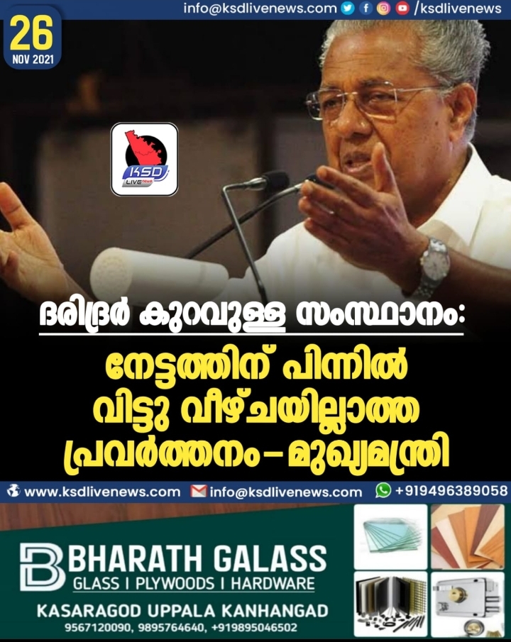 ദരിദ്രര് കുറവുള്ള സംസ്ഥാനം: നേട്ടത്തിന് പിന്നില് വിട്ടുവീഴ്ചയില്ലാത്ത പ്രവര്ത്തനം – മുഖ്യമന്ത്രി