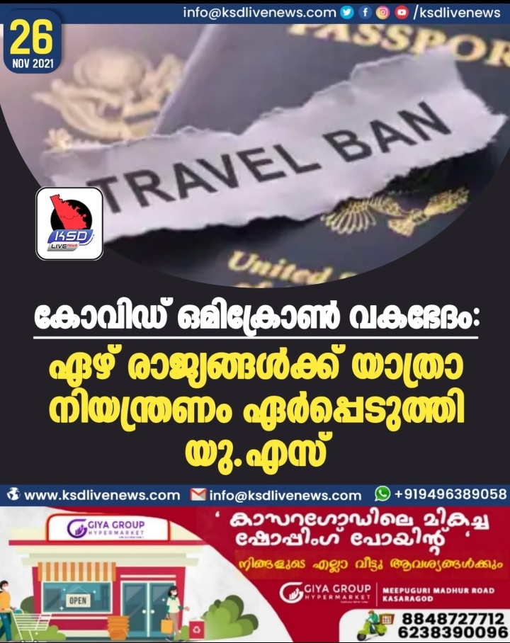 കോവിഡ് ഒമിക്രോണ് വകഭേദം: ഏഴ് രാജ്യങ്ങള്ക്ക് യാത്രാനിയന്ത്രണം ഏര്പ്പെടുത്തി യു.എസ്