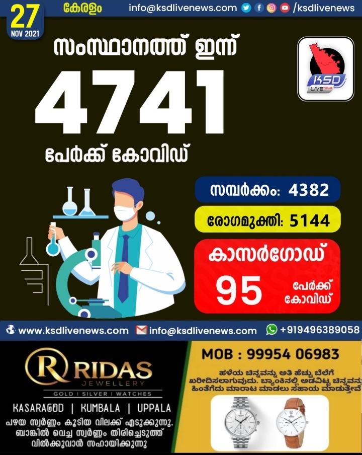 സംസ്ഥാനത്ത് ഇന്ന് 4741 പേർക്ക് കോവിഡ് സ്ഥിരീകരിച്ചു. സമ്പർക്കം വഴി 4382 പേർക്കും ; ആശ്വാസമായി 5144 പേർക്ക് രോഗ മുക്തിയും ; കാസർഗോഡ് ജില്ലയിൽ 95 പേർക്ക് പുതിയ കോവിഡ് കേസുകൾ ; മരണം 28