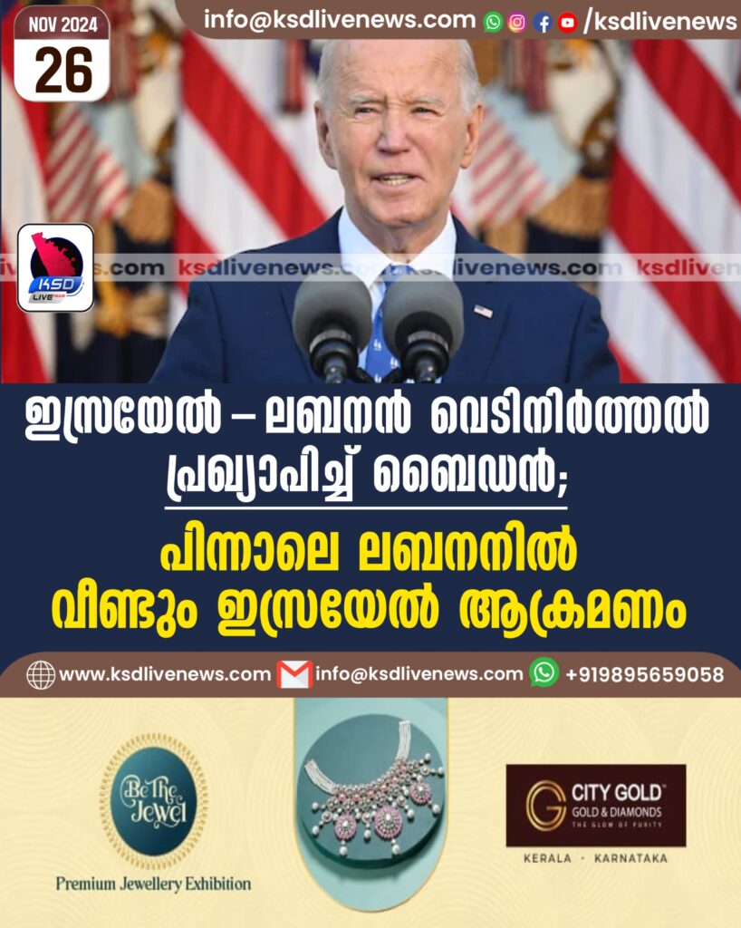 ഇസ്രയേൽ-ലബനൻ വെടിനിർത്തൽ പ്രഖ്യാപിച്ച് ബൈഡൻ; പിന്നാലെ ലബനനിൽ വീണ്ടും ഇസ്രയേൽ ആക്രമണം