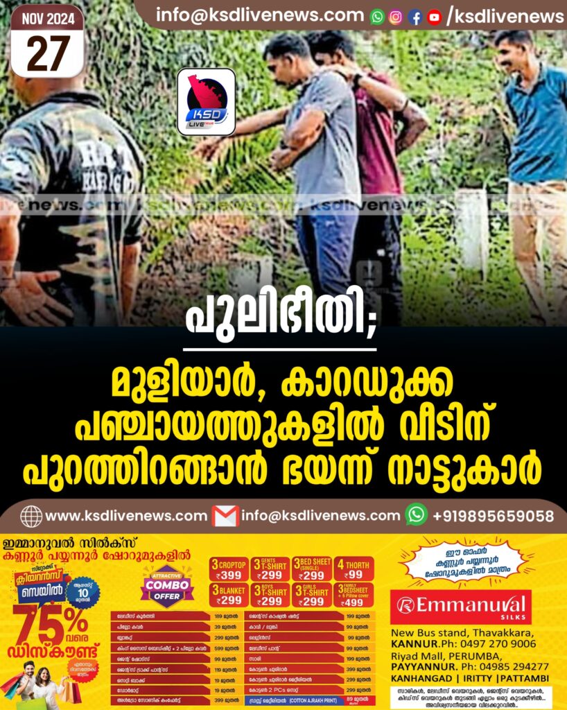 ബോവിക്കാനം: രാവിലെ നടക്കാൻ പോയിരുന്നവർ അതു നിർത്തി. സ്കൂളിലേക്കു നടന്നുപോയിരുന്ന കുട്ടികളുടെ യാത്ര വാഹനത്തിലേക്കു മാറ്റി. അവധി ദിവസങ്ങളിൽ കുട്ടികളെ കളിക്കാൻ വിടാതായി. തുറന്ന തൊഴുത്തിൽ പശുക്കളെ കെട്ടിയിട്ടിരുന്നവർ കിട്ടിയ വിലയ്ക്കു കൊടുത്ത് ഒഴിവാക്കി…പുലിയിറങ്ങിയതോടെ മുളിയാർ, കാറഡുക്ക പഞ്ചായത്തുകളിലെ ജനങ്ങളുടെ ജീവിതം ഓരോ നിമിഷവും ഭീതിയുടെ നിഴലിലാണ്. പുലിപ്പേടിയിൽ ജനങ്ങളുടെ ജീവിതക്രമം തന്നെ താളം തെറ്റി.
