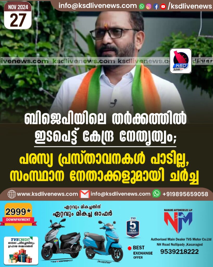 ബിജെപിയിലെ തര്ക്കത്തില് ഇടപെട്ട് കേന്ദ്ര നേതൃത്വം; പരസ്യ പ്രസ്താവനകള് പാടില്ല, സംസ്ഥാന നേതാക്കളുമായി ചര്ച്ച