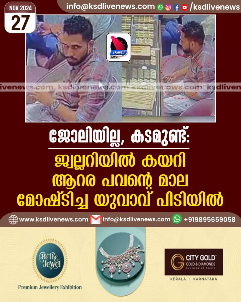 ജോലിയില്ല, കടമുണ്ട്: ജ്വല്ലറിയില് കയറി ആറര പവന്റെ മാല മോഷ്ടിച്ച യുവാവ് പിടിയില്
