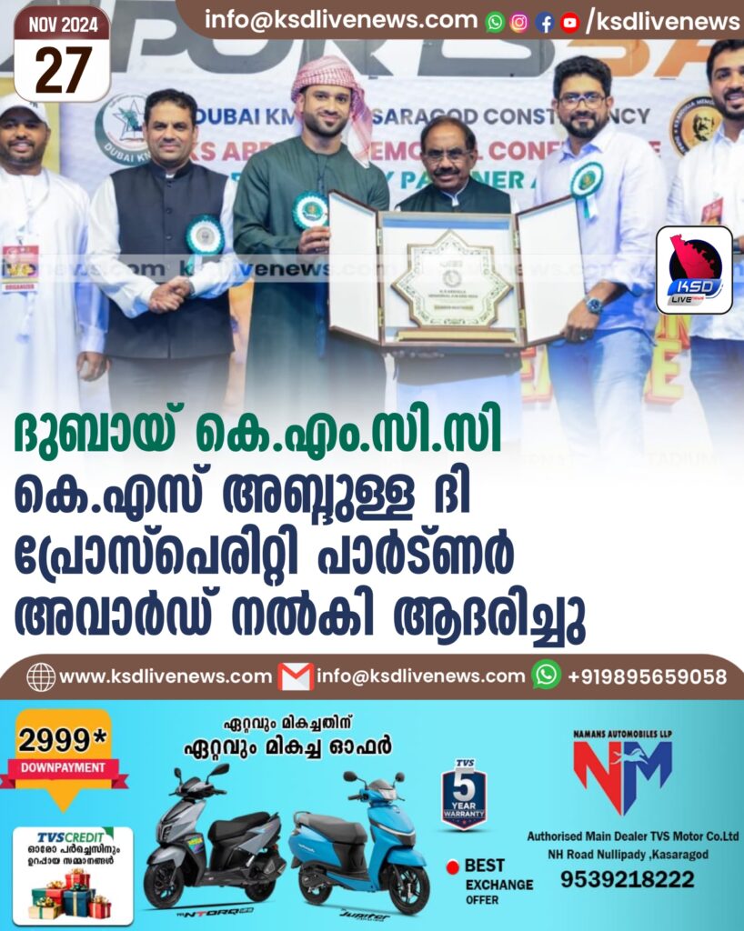 ദുബായ് കെ.എം.സി.സി കെ.എസ് അബ്ദുള്ള ദി പ്രോസ്പെരിറ്റി പാർട്ണർ അവാർഡ് നൽകി ആദരിച്ചു