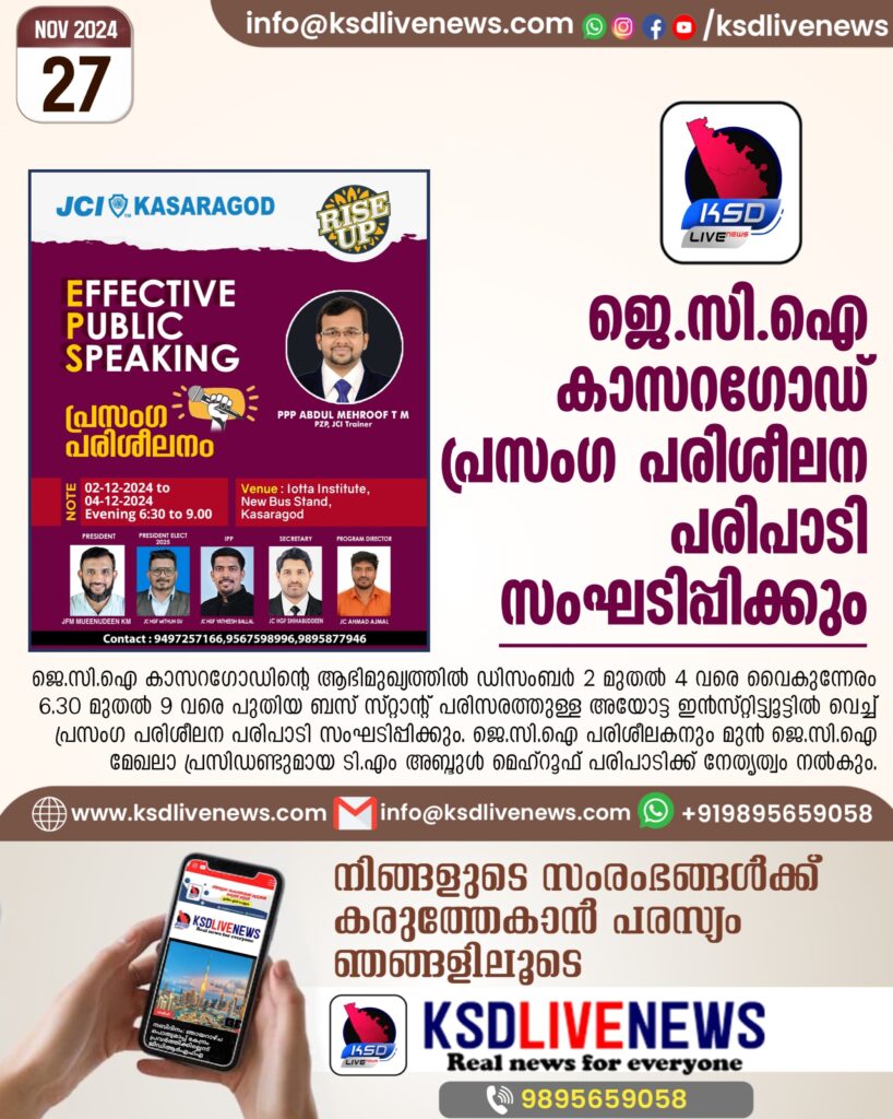 കാസറഗോഡ്: ജെ.സി.ഐ കാസറഗോഡിൻ്റെ ആഭിമുഖ്യത്തിൽ ഡിസംബർ 2 മുതൽ 4 വരെ വൈകുന്നേരം 6.30 മുതൽ 9 വരെ പുതിയ ബസ് സ്റ്റാൻ്റ് പരിസരത്തുള്ള അയോട്ട ഇൻസ്റ്റിട്ട്യൂട്ടിൽ വെച്ച് പ്രസംഗ പരിശീലന പരിപാടി സംഘടിപ്പിക്കും. ജെ.സി.ഐ പരിശീലകനും മുൻ ജെ.സി.ഐ മേഖലാ പ്രസിഡണ്ടുമായ ടി.എം അബ്ദുൾ മെഹ്റൂഫ് പരിപാടിക്ക് നേതൃത്വം നൽകും. പരിശീലന പരിപാടിയിൽ പങ്കെടുക്കാൻ താൽപര്യമുള്ള ബന്ധപെടുക ഫോൺ : 9497257166,9567598996,9895877946