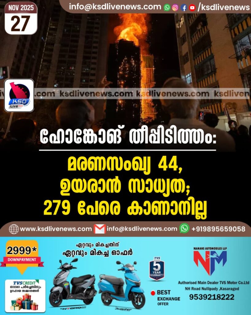 ഹോങ്കോങ് തീപ്പിടിത്തം: മരണസംഖ്യ 44, ഉയരാന് സാധ്യത; 279 പേരെ കാണാനില്ല