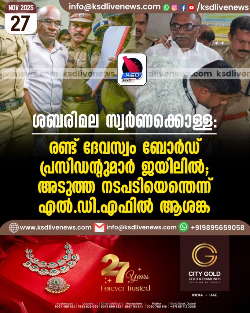 ശബരിമല സ്വർണക്കൊള്ള: രണ്ട് ദേവസ്വം ബോർഡ് പ്രസിഡന്റുമാർ ജയിലിൽ; അടുത്ത നടപടിയെന്തെന്ന് എൽഡിഎഫിൽ ആശങ്ക