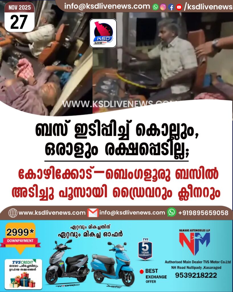 ബസ് ഇടിപ്പിച്ച് കൊല്ലും, ഒരാളും രക്ഷപ്പെടില്ല’; കോഴിക്കോട്–ബെംഗളൂരു ബസിൽ ‘അടിച്ചു പൂസായി’ ഡ്രൈവറും ക്ലീനറും