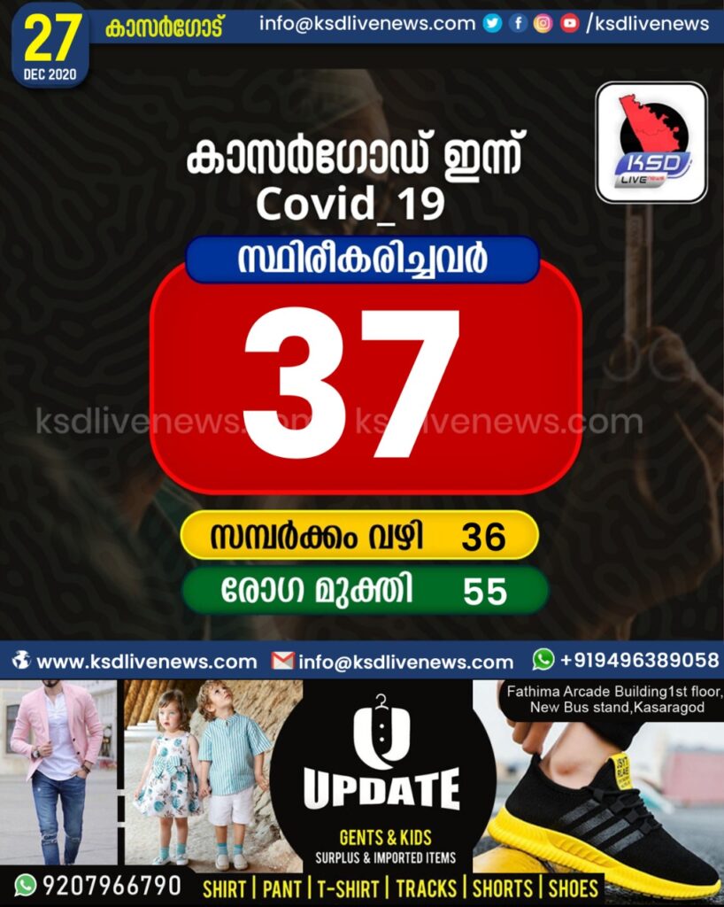 കാസര്കോട് ജില്ലയില് 37 പേര്ക്ക് കോവിഡ്, 55 പേര്ക്ക് രോഗമുക്തി
